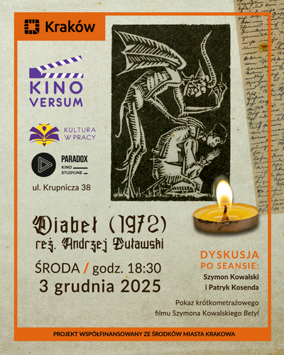 „Diabeł” w reżyserii Andrzeja Żuławskiego, jeden z najważniejszych polskich filmów grozy. Określany mianem horroru metafizycznego i politycznego, wchodzący w polemikę z polskimi romantykami, pytający o granice szaleństwa i racjonalność świata. Tytułowa postać grana przez Wojciecha Pszoniaka to jedna najbardziej sugestywnych ról polskiego kina. O filmie więcej opowiedzą poeta i filmowiec Szymon Kowalski oraz pisarz i działacz Patryk Kosenda. To wydarzenie będzie miało charakter szczególny – obok seansu głównego i rozmowy, odbędzie się również pokaz nowego krótkometrażowego filmu Kowalskiego pt. „Betyl”.