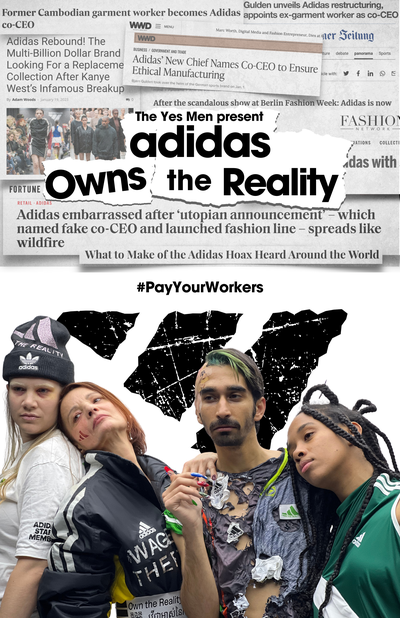 Yes Men – specjaliści od wrabiania korporacji – tym razem biorą na celownik Adidasa, któremu wytykają bezwzględne wykorzystywanie pracowników w Azji. Podszywając się pod giganta przy pomocy przemyślanej kampanii (i odjechanej kolekcji mody na Berlin Fashion Week), zmuszą go do oficjalnego odcięcia się od ich pomysłu. A to będzie przyznaniem się do stosowania nieetycznych praktyk…
